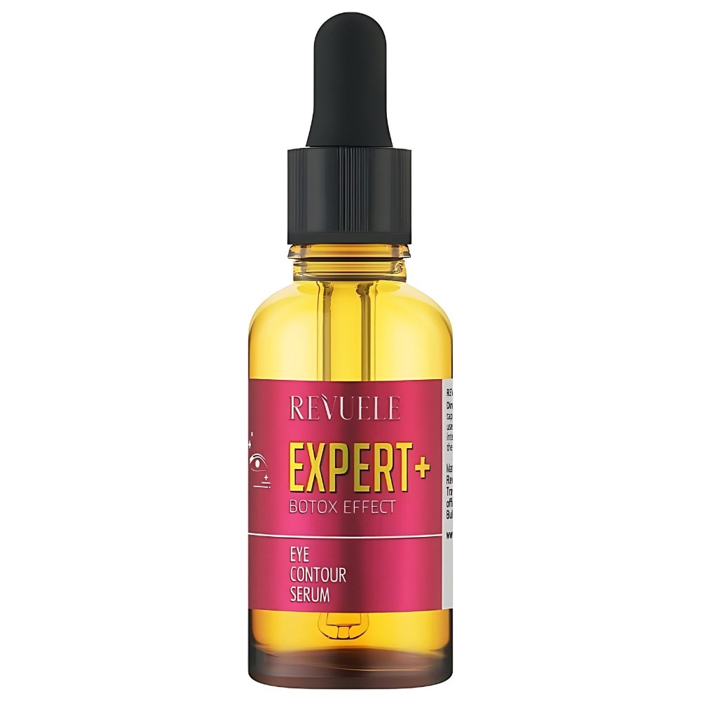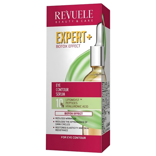 Сироватка Revital Botox з ефектом контуру очей містить пептиди та гіалуронову кислоту, які заспокоюють ніжну шкіру навколо очей, зменшують появу мішків та появу темних кіл. Висококонцентрована сироватка для контуру очей фокусується на зморшках та забезпечує глибоке відновлення клітин. Сироватка з ефектом ботокса розгладжує тонкі лінії, роблячи шкіру помітно гладкішою і м’якшою.