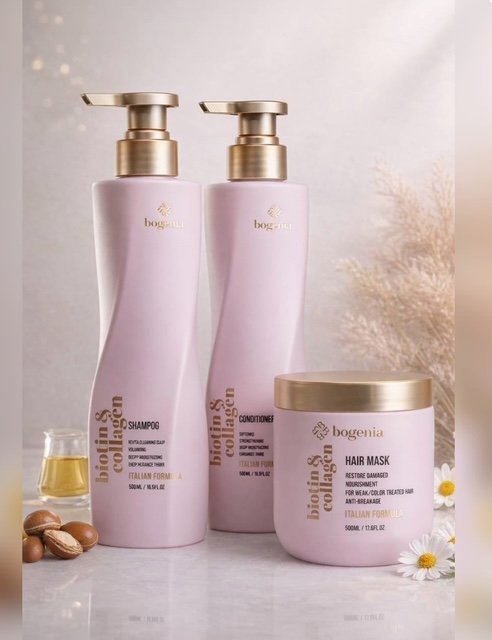 Шампунь з біотином та колагеном Bogenia Biotin & Collagen Shampoo – відновлює та зміцнює волосся завдяки біотину, колагену, аргановій олії та маслу ши.